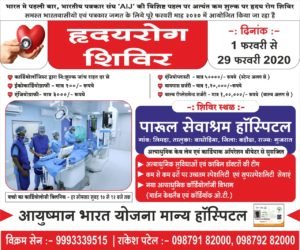 **भारत वर्ष में पहली बार भारतीय पत्रकार संघ ‘AIJ’ की विशिष्ट पहल** पर ‘पारुल सेवाश्रम हॉस्पिटल’ वड़ोदरा गुजरात द्वारा विराट हृदय रोग निदान शिविर का आयोजन पूरे फरवरी माह में होने जा रहा है। यह आयोजन समस्त पत्रकार जगत व उनके परिजनों के साथ साथ भारत वर्ष के सभी नागरिक जन के हितार्थ हो रहा हैं। विश्वस्तरीय सुविधाओं से युक्त इस हॉस्पिटल में सुपर स्पेशलिस्ट डॉक्टर सेवारत हैं। bsp24news 6264105390