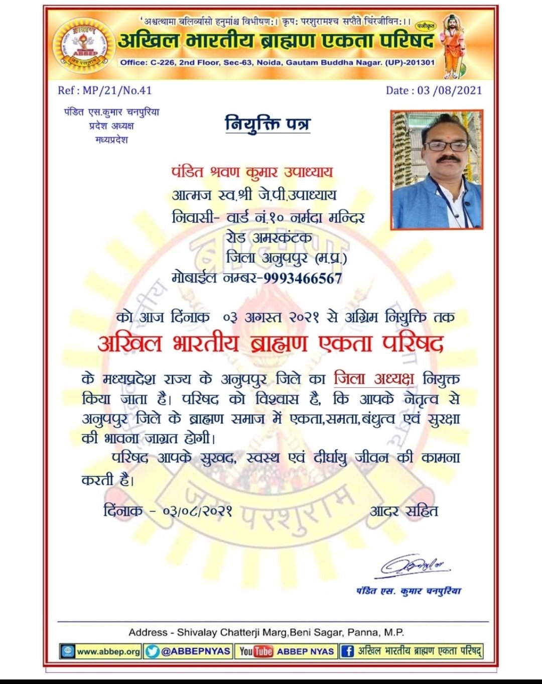 पण्डित आशीष शर्मा प्रदेश महासचिव के अभिमत से सहमत होकर,प्रदेश अध्यक्ष श्री एस.कुमार चनपुरिया द्वारा पंडित श्री श्रवण कुमार उपाध्याय को जिला अध्यक्ष अनूपपुर के पद पर नियुक्ति किया गया है । श्री श्रवण कुमार उपाध्याय को हार्दिक बधाई।