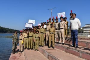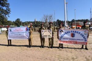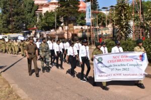 आज दिनांक 27. 11. 2022 को एनसीसी दिवस के अवसर पर 7 मध्य प्रदेश (ई) एनसीसी शहडोल के कमान अधिकारी कर्नल शरद पाठक के आदेश अनुसार एवं विद्यालय की प्राचार्य सुश्री कविता सिंह के निर्देश में विद्यालय के एनसीसी अधिकारी श्री महेश्वर द्विवेदी, कला – शिक्षिका श्रीमती विद्या सोनी एवं शहडोल के यूनिट से हवलदार अरविंद सिंह, एस यू ओ मयंक सिंह, यू ओ धन सिंह, यू ओ संस्कार सोनी, सी एस एम चंद्रवीर के साथ विद्यालय के 80 कैडेट्स ने अमरकंटक स्थित नर्मदा मंदिर प्रांगण एवं रामघाट पर फैले पॉलिथीन, कचरा आदि को साफ कर लोगों को नदियों को स्वच्छ रखने की अपील की ।