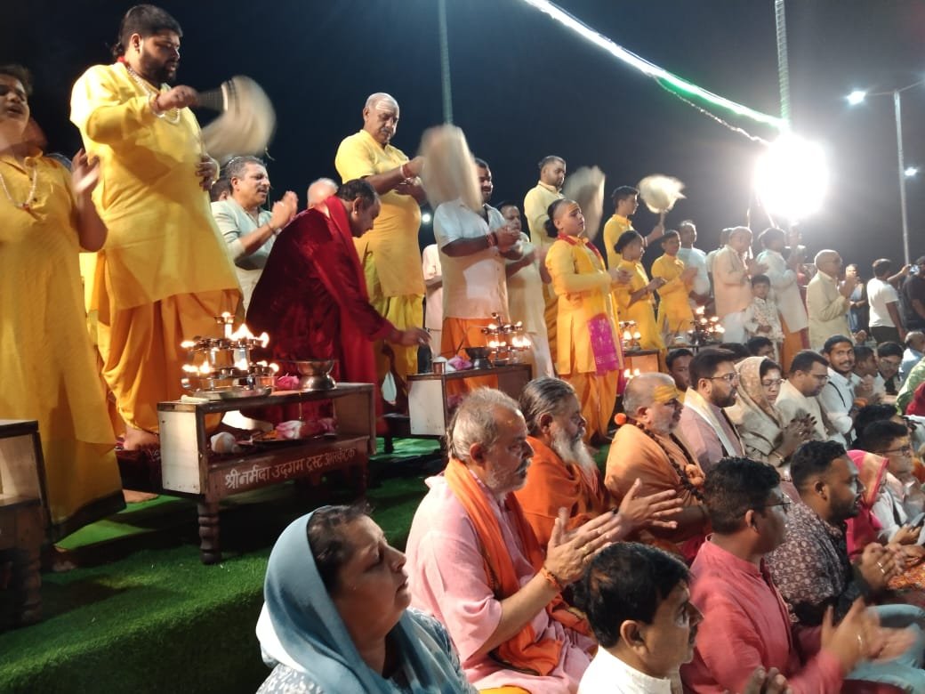 मृत्युंजय आश्रम में चल रही भागवत कथा में पधारे सभी गोयल परिवार , श्रद्धालुओ , भक्तों तथा संतो – महंतो , नर्मदा मंदिर पुजारियों की गरिमामई उपस्थिति में नर्मदा तट रामघाट में रविवार को संध्या कालीन स्वामी हरिहरानंद महाराज के पावन सानिध्य में कथा वाचक अनुराग कृष्णशास्त्री जी सपत्नीक , श्रीमहंत रामभूषण दास जी शांति कुटी , योगेश दुबे सपत्नीक , गोयल परिवार कोरबा,कटघोरा (छत्तीसगढ़) की उपस्थिति में रविवार को मां रेवा जी की भव्य महाआरती की गई जिसमे सभी भावविभोर हो उठे । कल मंगलवार सुबह 10 आस पास मां नर्मदा जी को रामघाट तट पर गोयल परिवार की ओर से विशाल चुनरी मां नर्मदा जी को उढ़ाई जायेगी ।